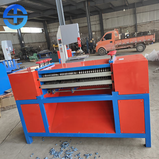 Радиаторы кондиционера почти исключительно сделаны медной трубы и алюминиевого ребра. Для того чтобы повторно использовать для того чтобы сдавать в утиль радиатор AC, медь и алюминий быть отделенным получить более высокую цену. Радиатор повторно используя машину конструирован для того чтобы обнажать и отделить радиатор утиля для повторно использовать медь и алюминий с высокой эффективностью и стабилизированным представлением. 3 вида расстояния лезвия разбивочного: 19mm, 21mm и 25mm; что сказать оно может обнажать радиатор чей расстояние медной трубки разбивочное 19mm, 21mm или 25mm. Перед обработанный, радиаторы будут отрезаны с ленточнопильным станком в части некоторой ширины. Она может отделить один слой или 2 радиатора слоев. Когда радиаторы больше чем 2 слоя, оно будет отрезано в один слой или 2 слоя машиной ленточнопильного станка.